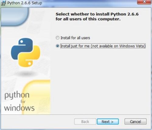 ずいぶん前にした質問を自己解決できそうなので、その手順をメモしておく。 使ったのはPython2.6.6+Windows7。コピーして試してみたのはWindowsXP。 Python2.6.6のインストール まずはネタ元のPythonをインストール。重要なのは「Install just for me」。こ…